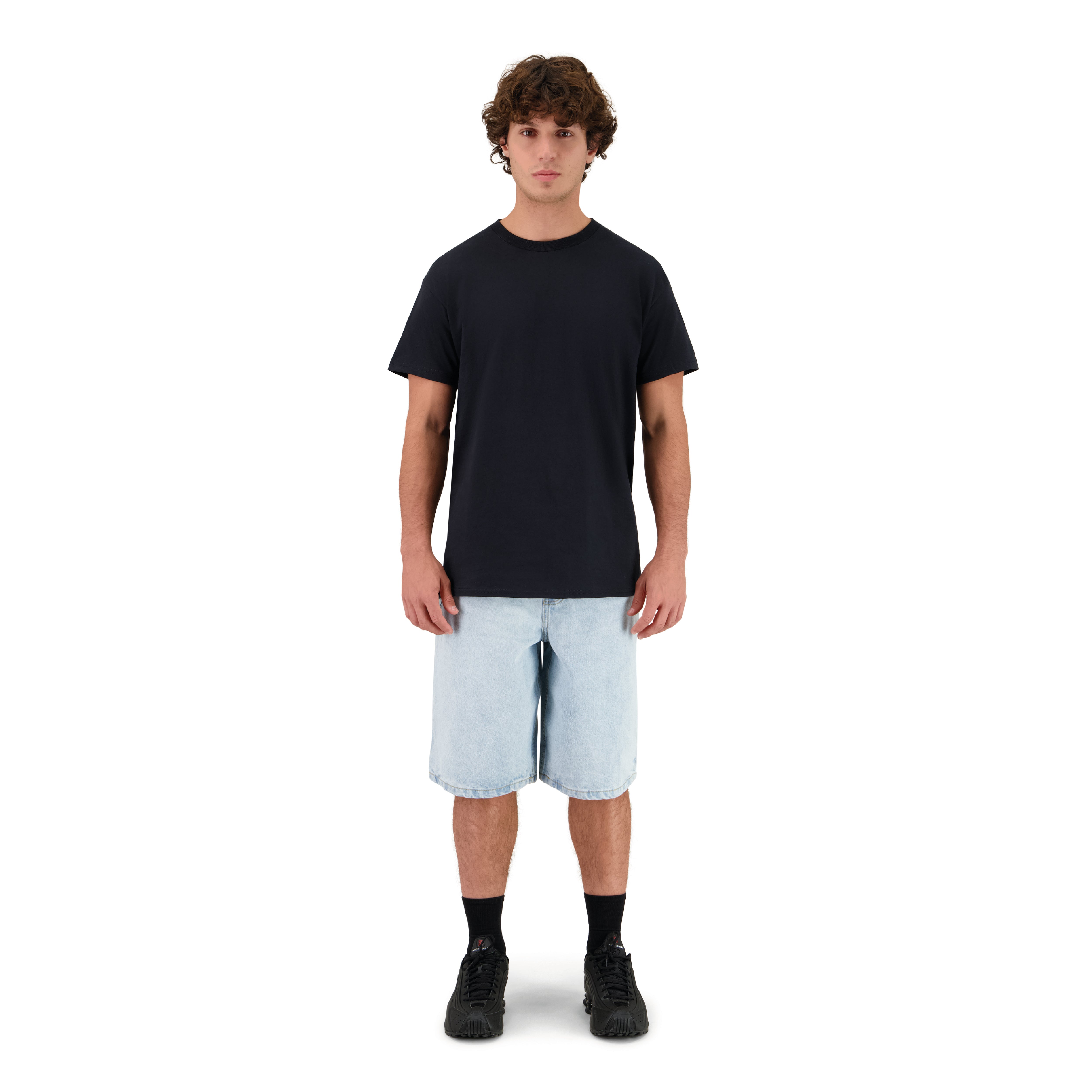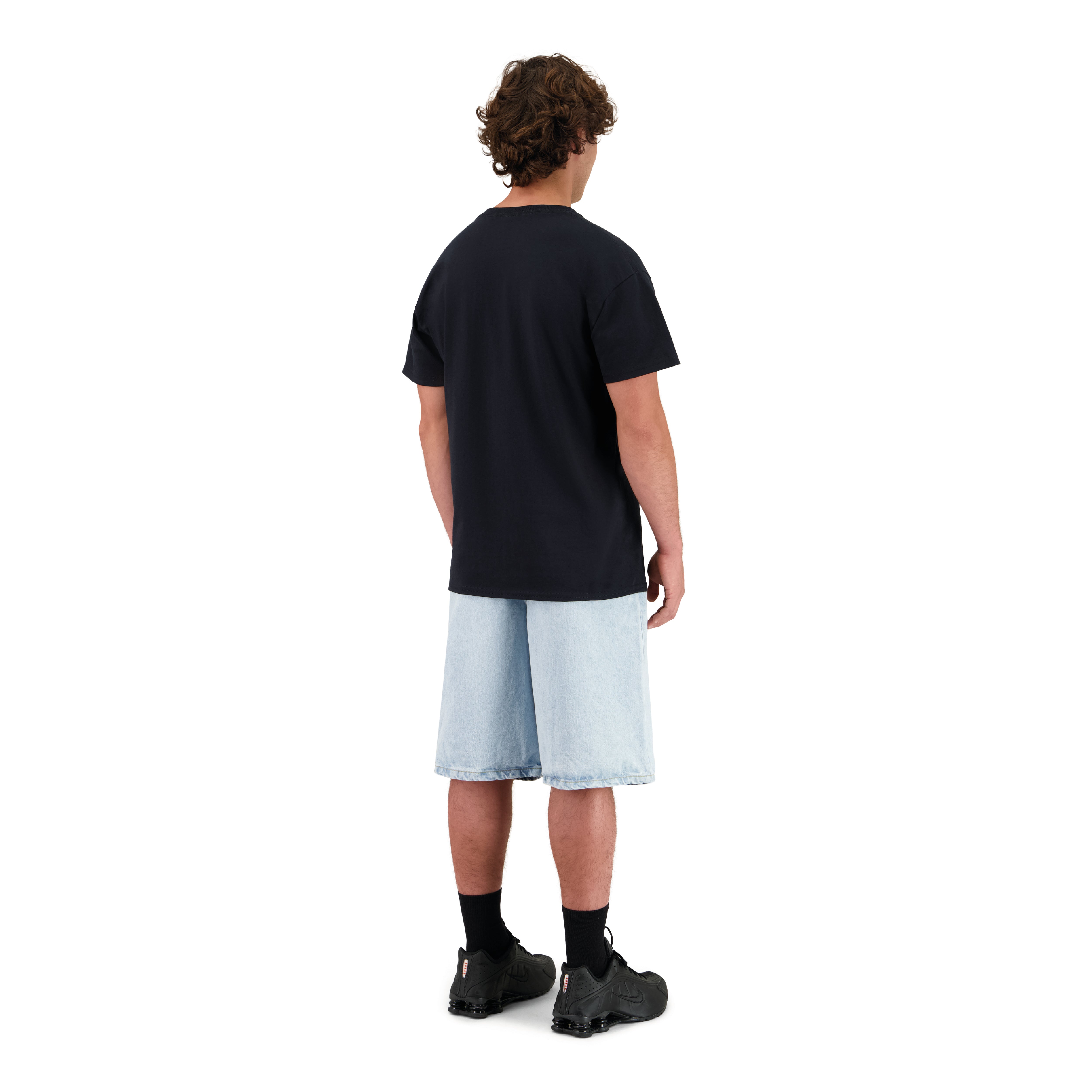 DAS MODEL IST 183CM GROSS, ER TRÄGT EIN T-SHIRT IN GRÖSSE L UND EINE JEANS SHORTS IN GRÖSSE M – 32US.